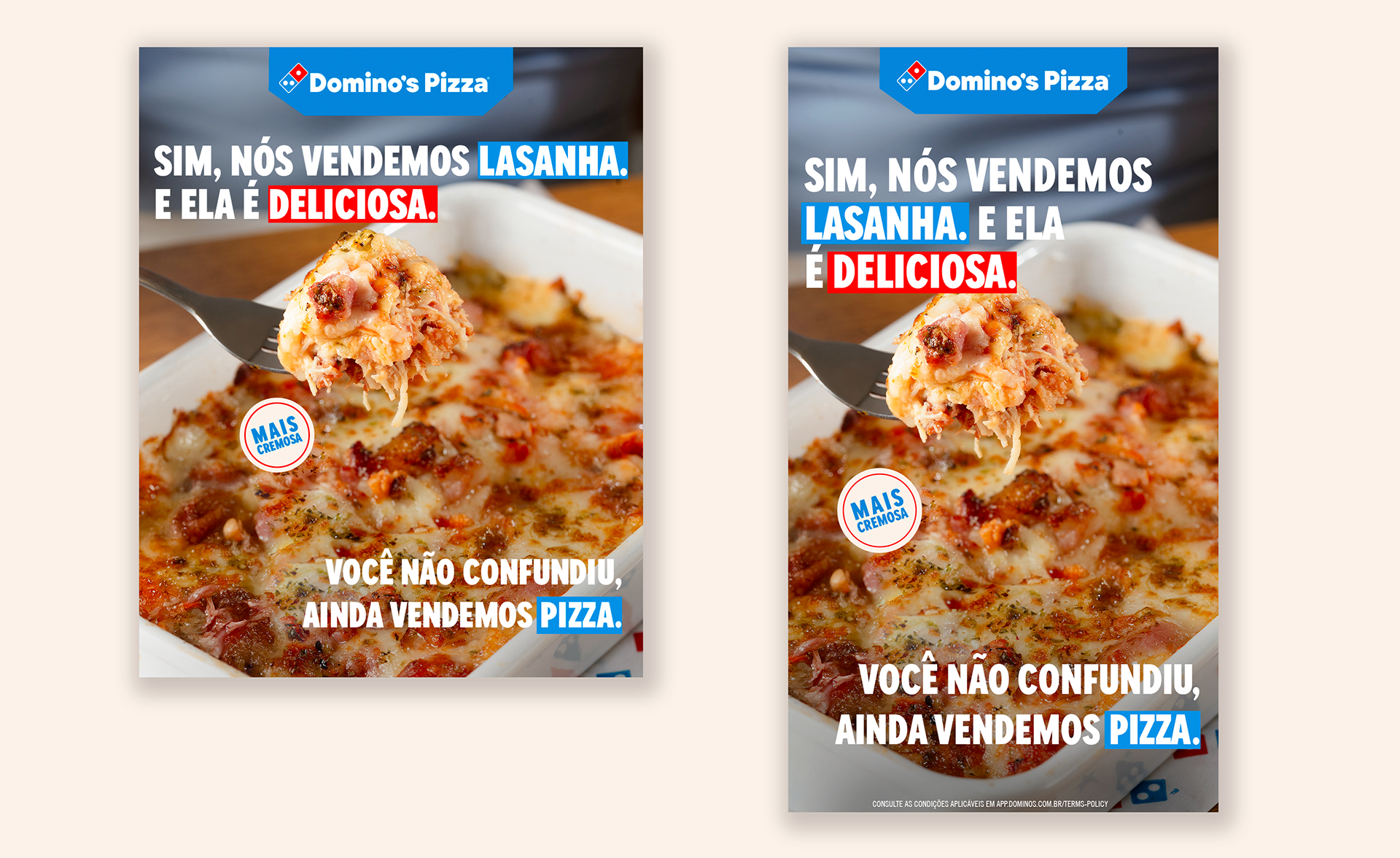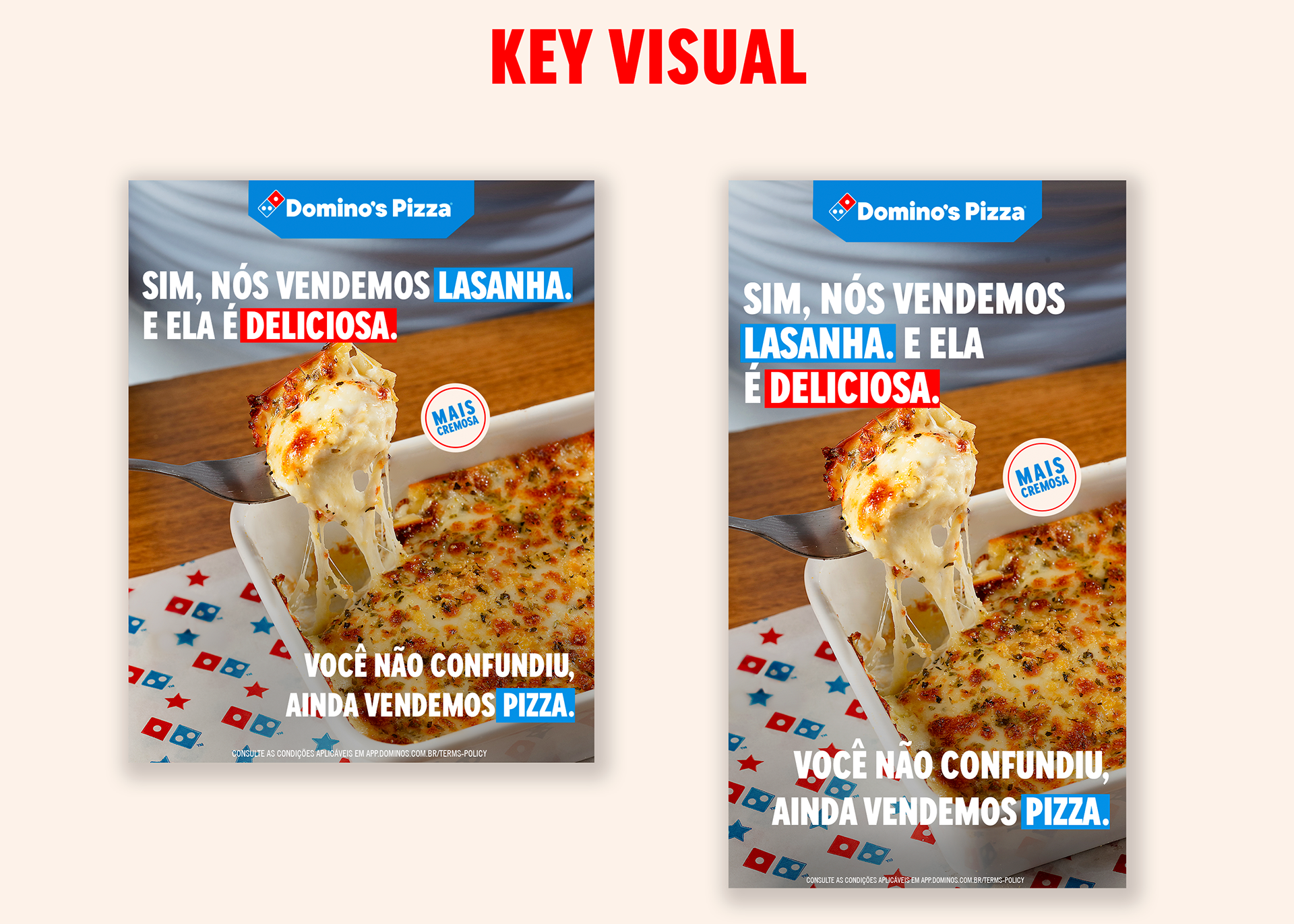 Campanha criada para apresentar a nova receita de lasanhas da Domino’s, mais cremosa, e ampliar a percepção da marca para além da pizza, posicionando a lasanha como uma opção prática e atrativa para o horário de almoço. O conceito parte da quebra de expectativa de que a Domino’s é “só pizza”, reforçando que a marca continua sendo pizza, mas também resolve o almoço — seja na loja ou em casa. A comunicação trabalha esse contraste de forma direta e provocativa, mantendo o DNA da marca enquanto expande seu território de consumo. Atuei no projeto desde as etapas iniciais de planejamento e cronograma até a construção do conceito, direção de arte e design das peças, além de participar do shooting fotográfico para o desenvolvimento do KV e dos desdobramentos da campanha.