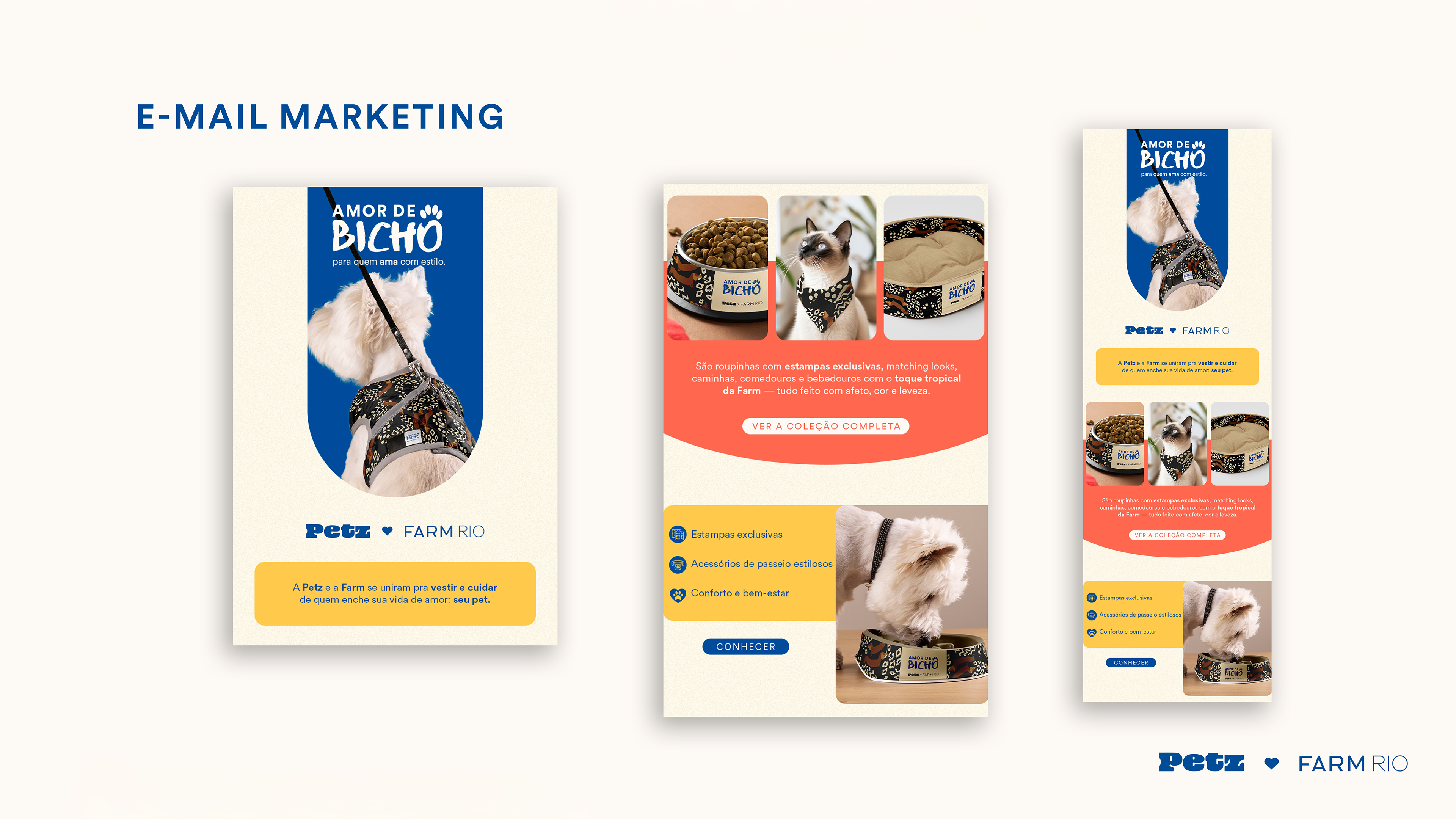 Conceito criativo da collab Farm + Petz: Amor de Bicho, celebrando a conexão entre tutores e pets;